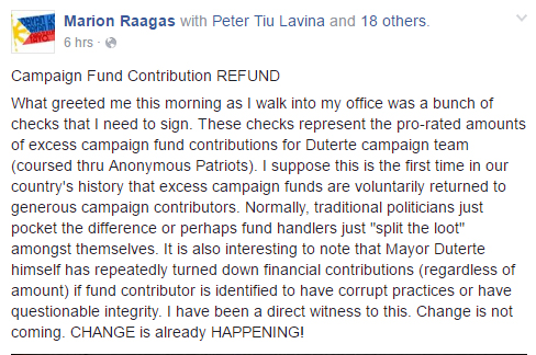 Duterte, before continuously receiving campaign funds from his supporters nationwide and even in other countries. Duterte is really serious about his quote " Change is Coming". He wants to start it to himself by returning the excess fund to those who contribute.